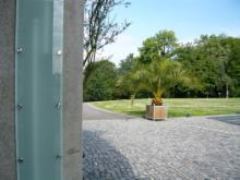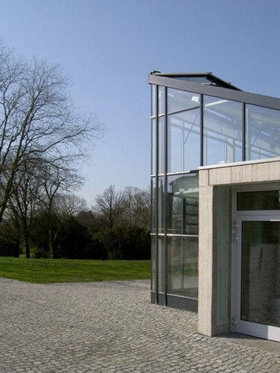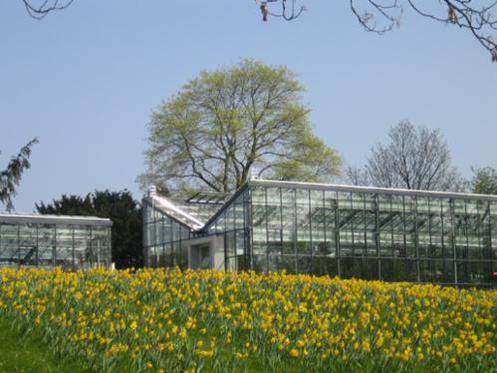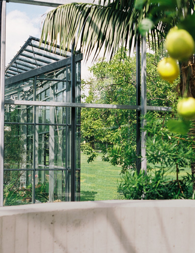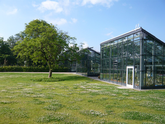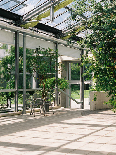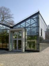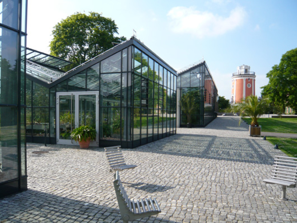 Die öffentlich zugänglichen Schauhäuser stellen eine deutliche Verbindung zum Botanischen Garten, sowie einen bewusst gestalterischen Kontrast zu einem historischen Gebäudeensemble mit Aussichtsturm