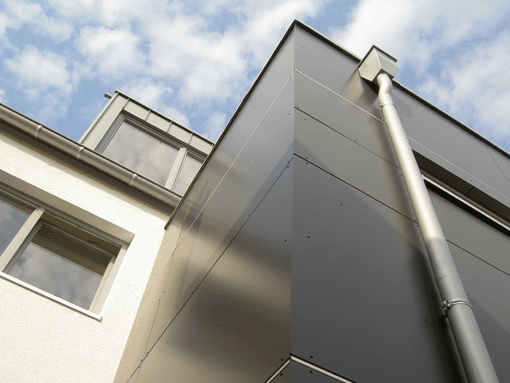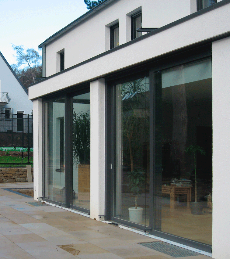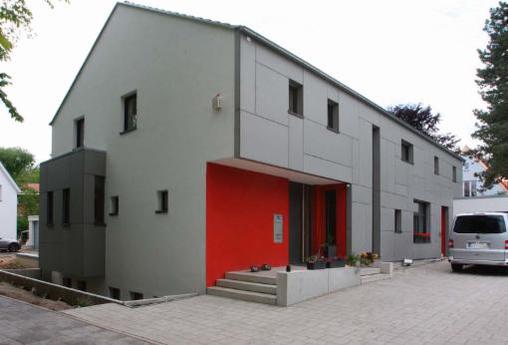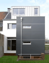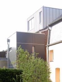 Das 280 m² Wohnfläche umfassende neugebaute Mehrgenerationenwohnhaus präsentiert sich mit zwei Gesichtern. Die Gartenfassade mit einer einfachen hellen Putzfassade und einem vorgebauten Wintergarten. Die Nordfassade mit den Zugängen schützt sich in einer mit einem Fugenspiel ausgearbeiteten Umkleidung.