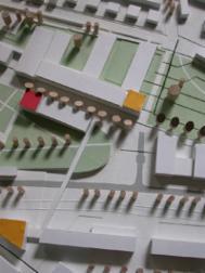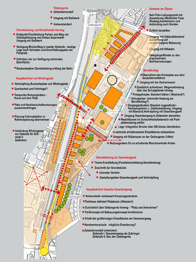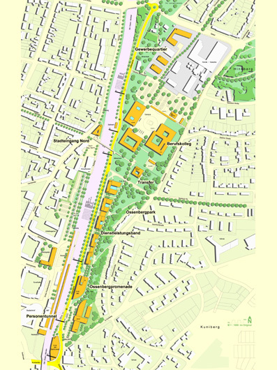 Zusammenhang gebracht werden. Neue Nutzungsabsichten im bahnhofsnahen Umfeld wurden zugleich planerisch konkretisiert. Ein Dienstleistungsband, in anpassungsfähige Sequenzen gegliedert, verbindet den