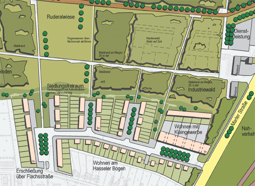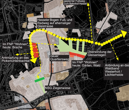 Die zu erarbeitende Rahmenplanung wurde dabei als ein langfristig wirksames Planungsinstrument verstanden, dass die bis heute entwickelten städtebaulichen und regionalen freiraumplanerischen Ansätze berücksichtigen.